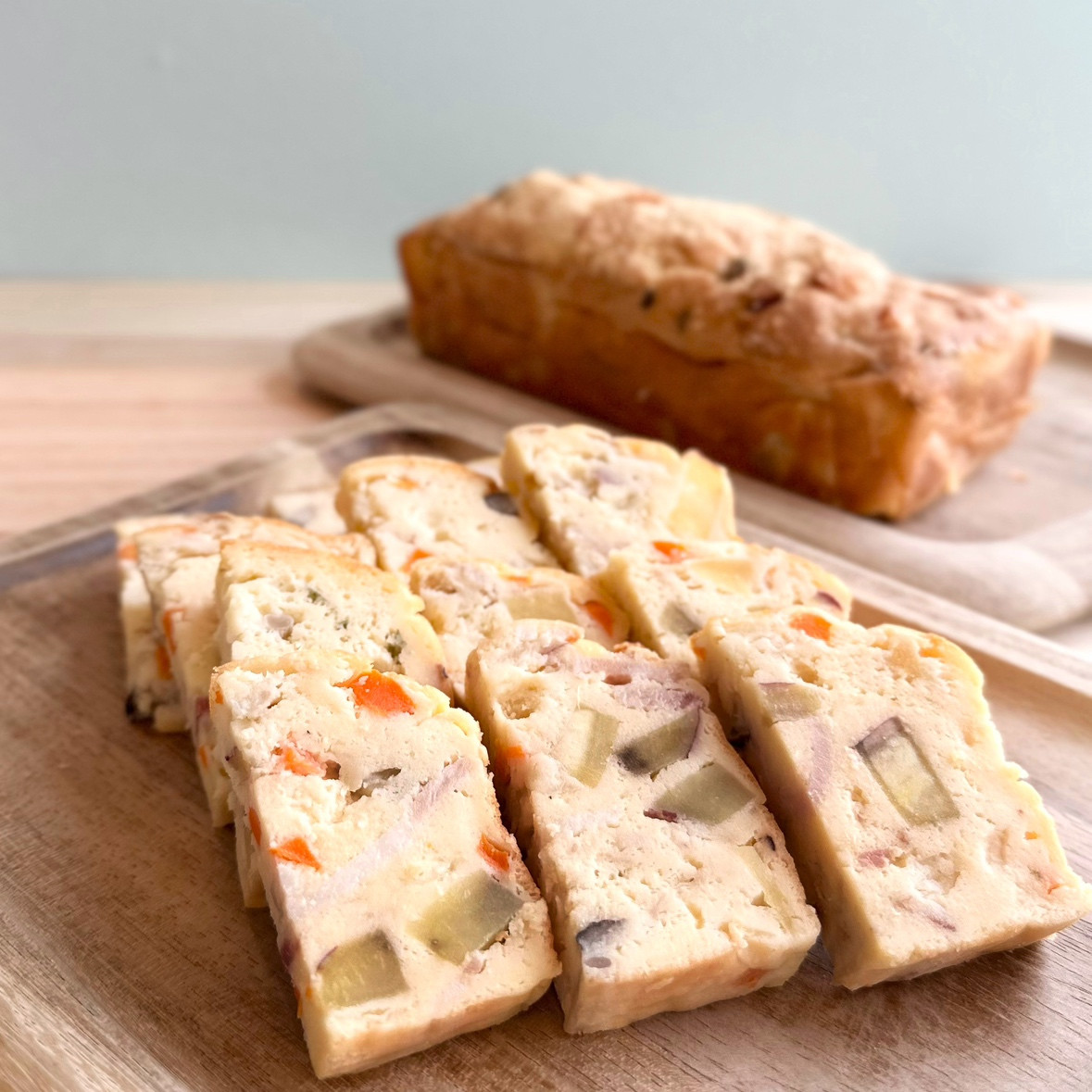 定番メニューとしてお出ししているケークサレ。その時々の季節のお野菜を混ぜ込んでいますが、今回はさつま芋としめじを入れてまた違った風味に仕上げてみました。米粉と豆乳を使用した優しい味わいの生地と、いろいろなお野菜の味を一緒に楽しめる一品です。(アレルギー:卵、乳、大豆、豚肉)