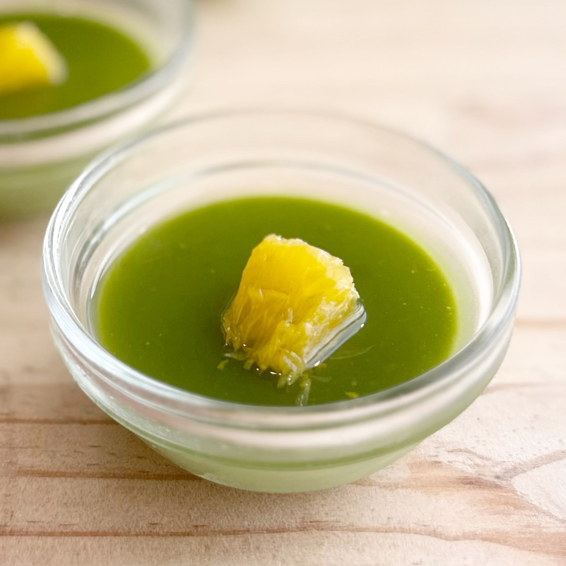 抹茶が香る大人風味のプリンに、オレンジの果肉とソースを添えました。抹茶とオレンジのそれぞれの風味が組み合わさって絶妙な味わいに仕上がっています。小ぶりサイズなので食後のデザートにもピッタリです。(アレルギー:乳、ゼラチン、オレンジ)