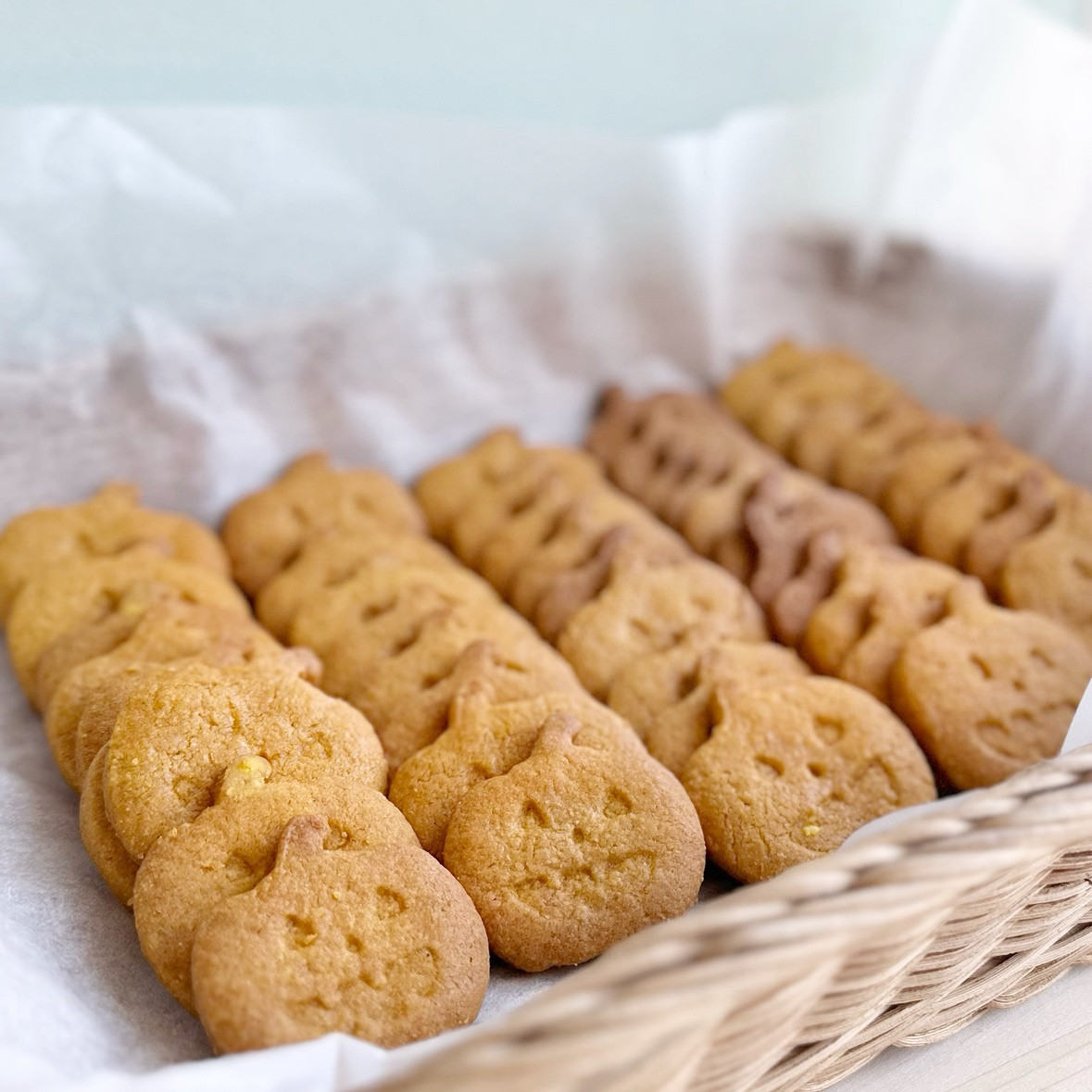 ハロウィンにちなんで、かぼちゃを練り込んだソフトクッキーを作ってみました。ほんのりとかぼちゃの風味を感じる、優しいお味のクッキーです。笑ったジャック・オー・ランタン(オバケかぼちゃ)の顔も可愛いと特に女性やお子さまに喜ばれています。見た目にも楽しい今だけの特別なクッキーをお楽しみください。(アレルギー:卵、乳、小麦)
