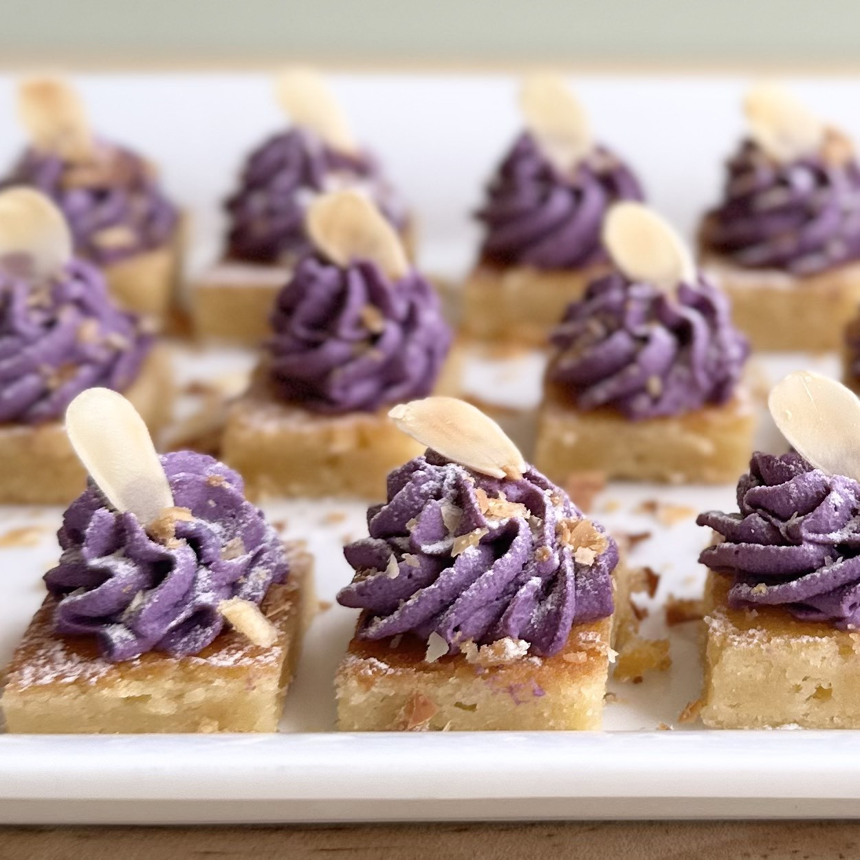 秋の深まりに映える、色鮮やかな紫芋のタルトをご用意しました。優しい甘さの紫芋クリームと、アーモンドプードルを使った生地の組み合わせが絶妙な一品です。トッピングのスライスアーモンドや落ち葉をイメージしたデコレーションも秋らしい季節限定のスイーツです。(アレルギー:乳、卵、小麦、アーモンド)
