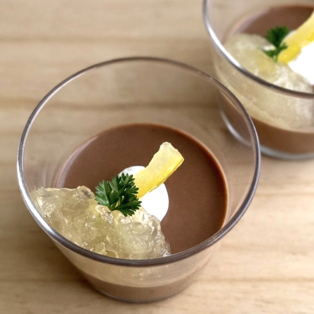 厳選したチョコレートを使用した特製のチョコプリンに、日向夏ジュレの爽やかな風味をプラスしました。(アレルギー:乳、オレンジ、ゼラチン)